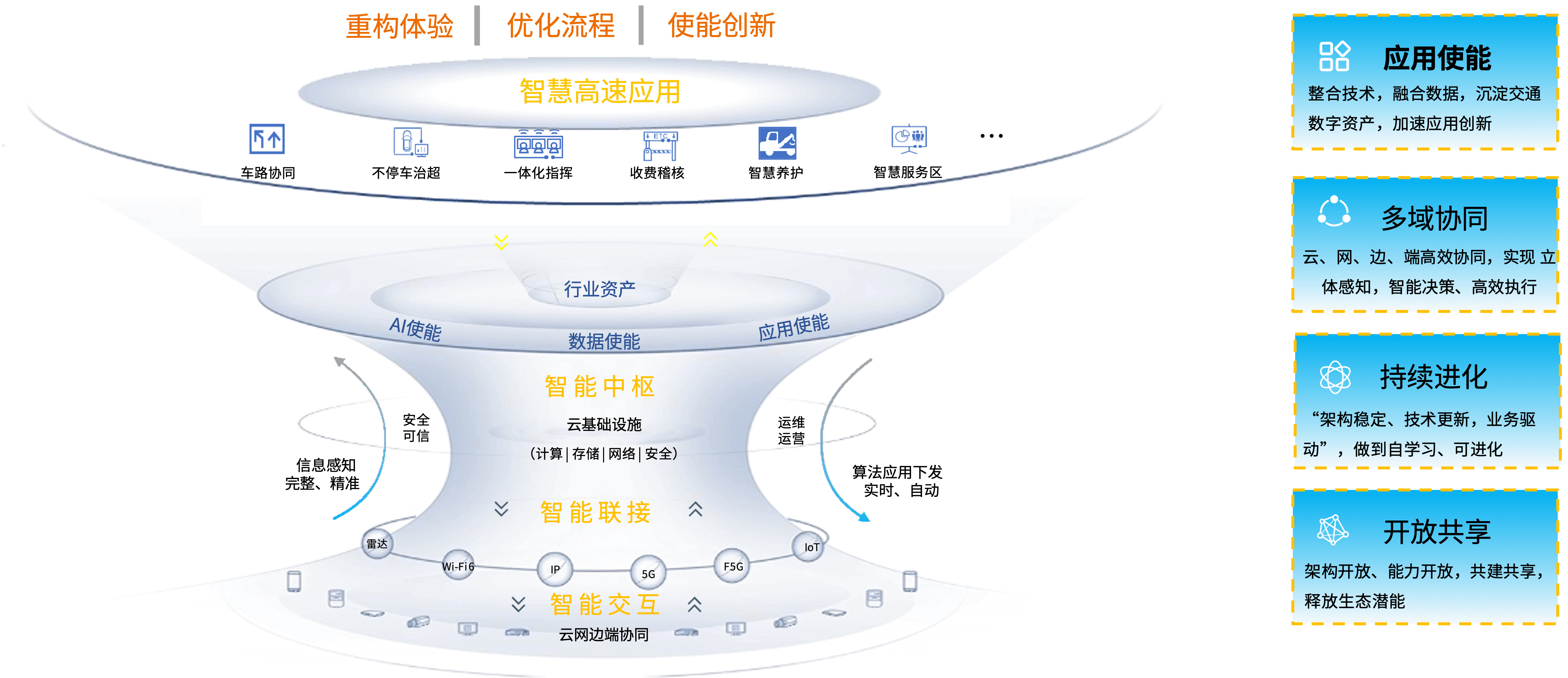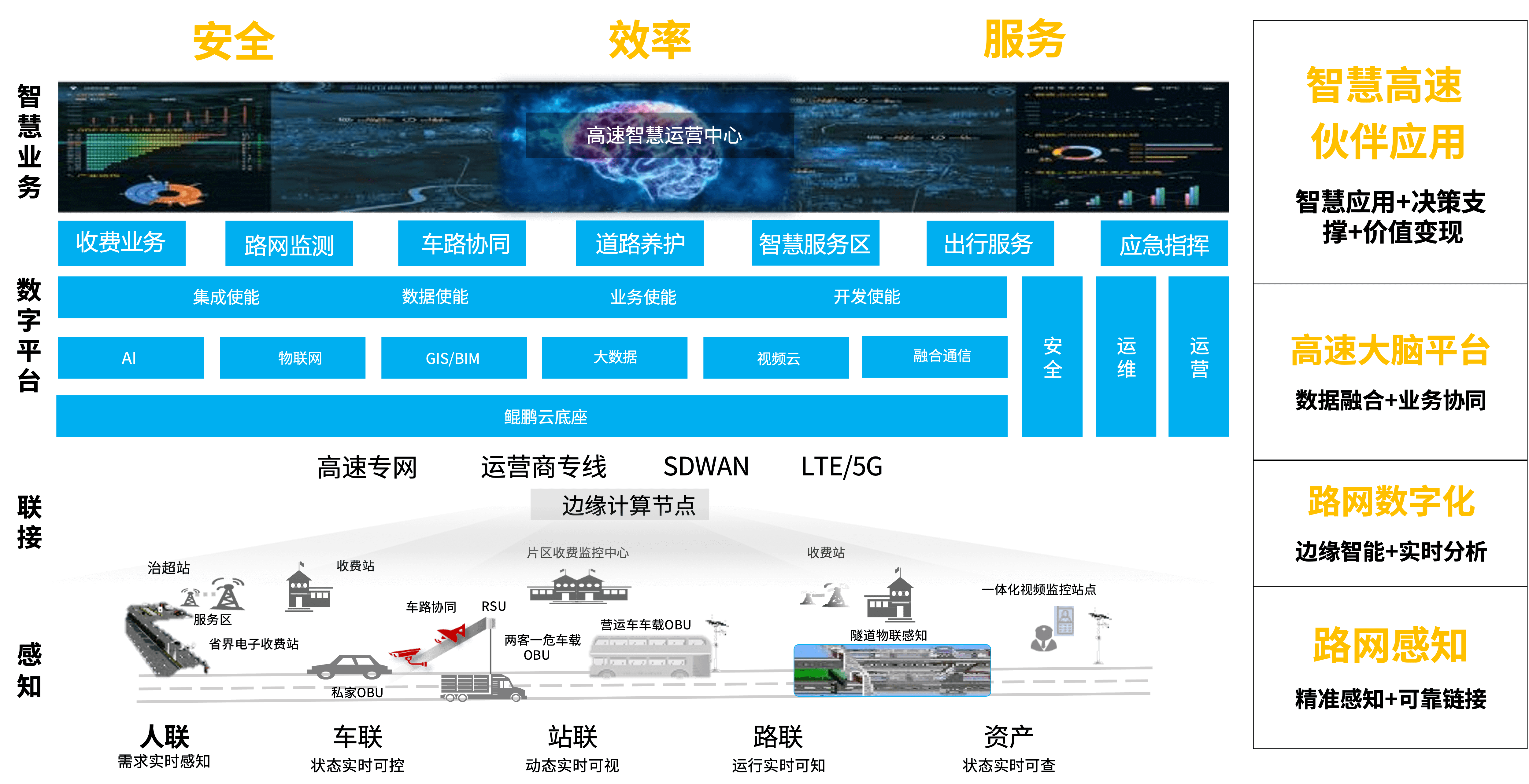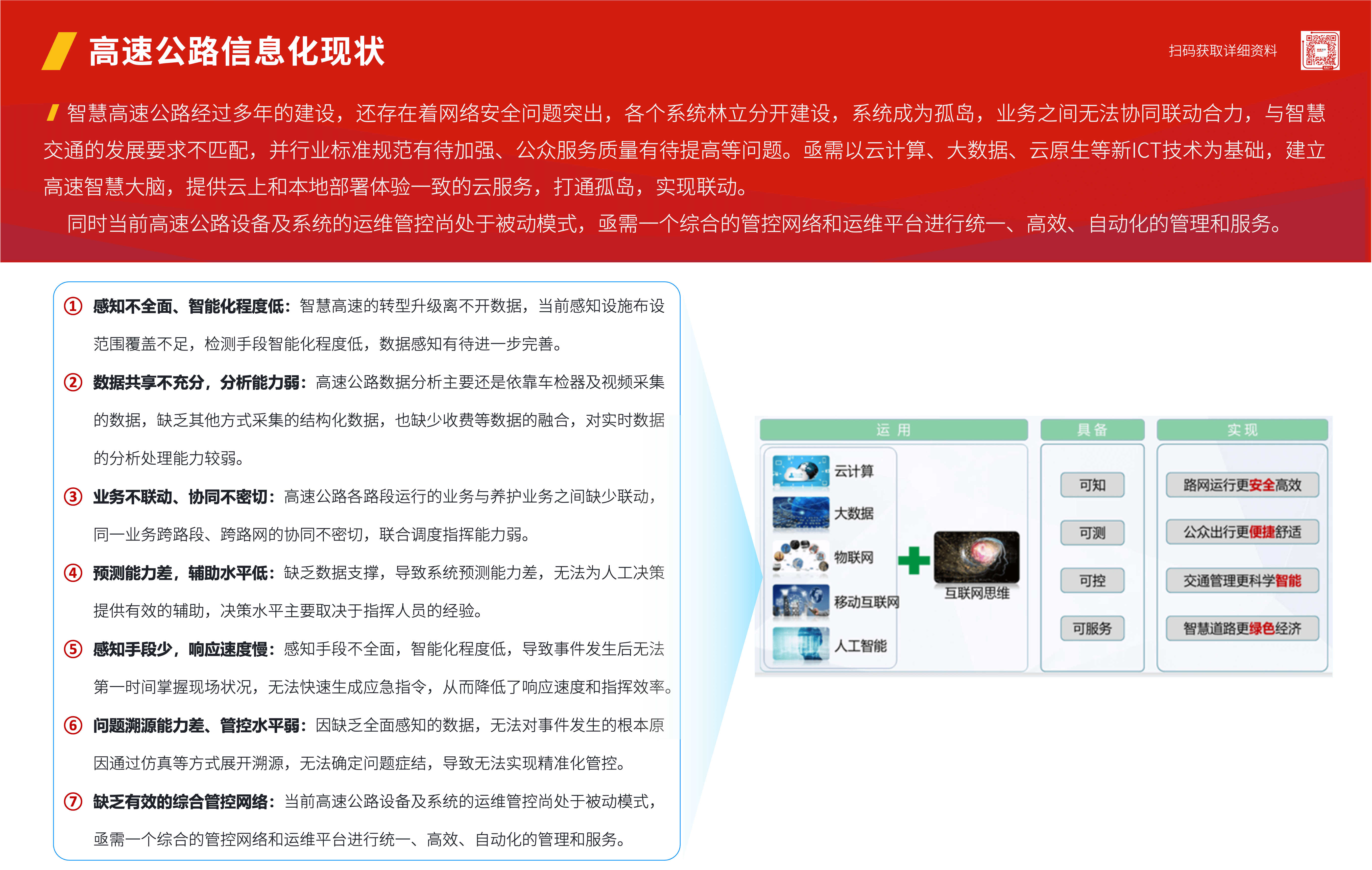 以云计算、大数据、云原生等新ICT技术为基础,打造全时空运行监测、全路域主动管控、全方位出行服务的智慧高速公路解决方案。