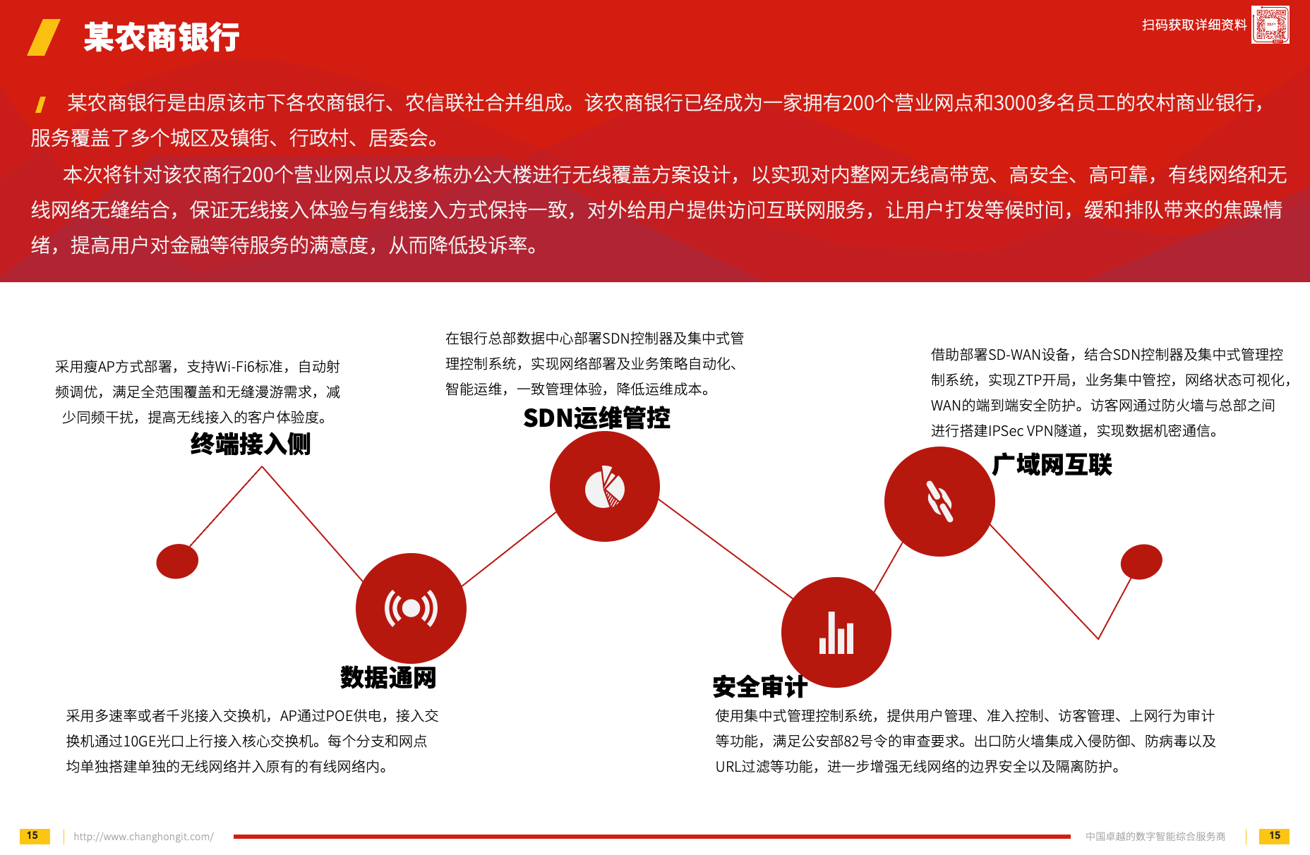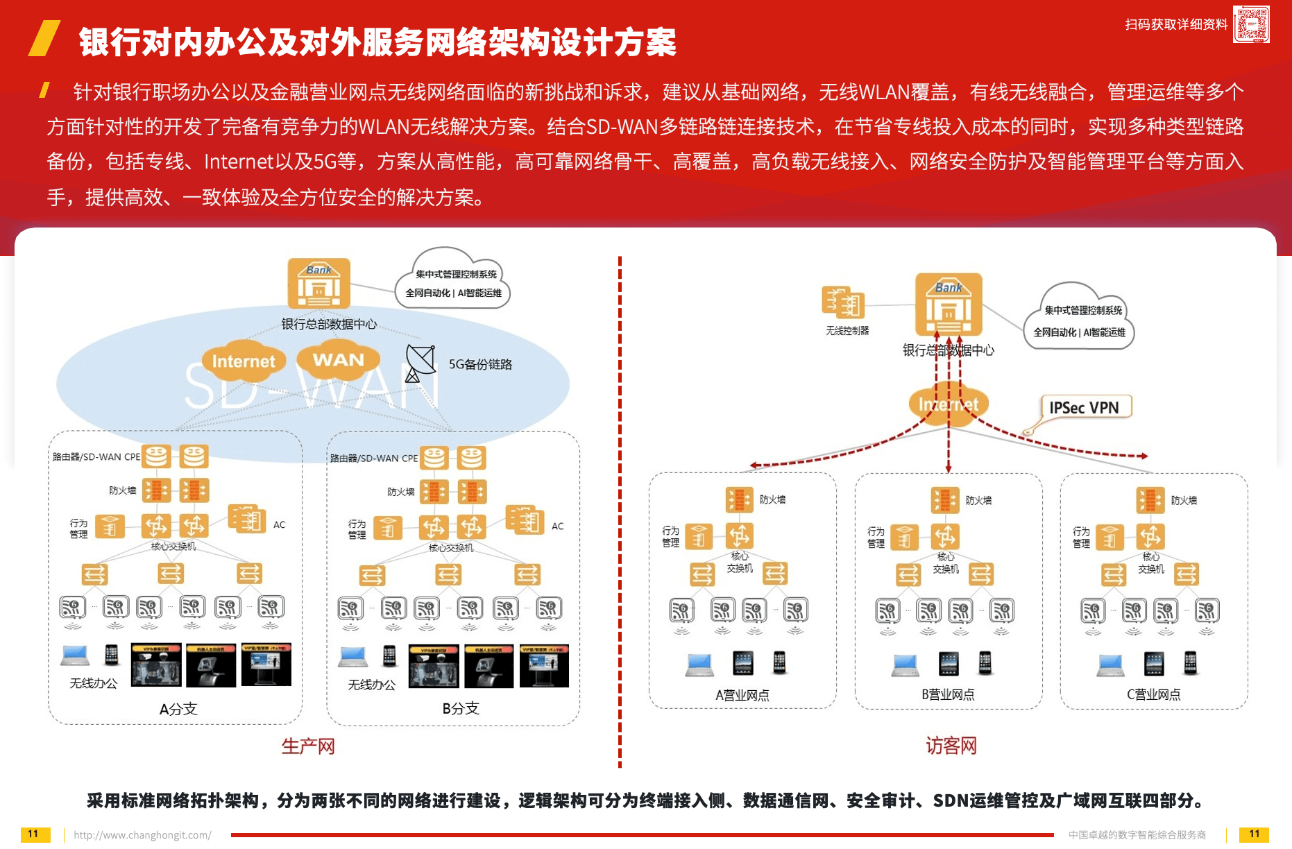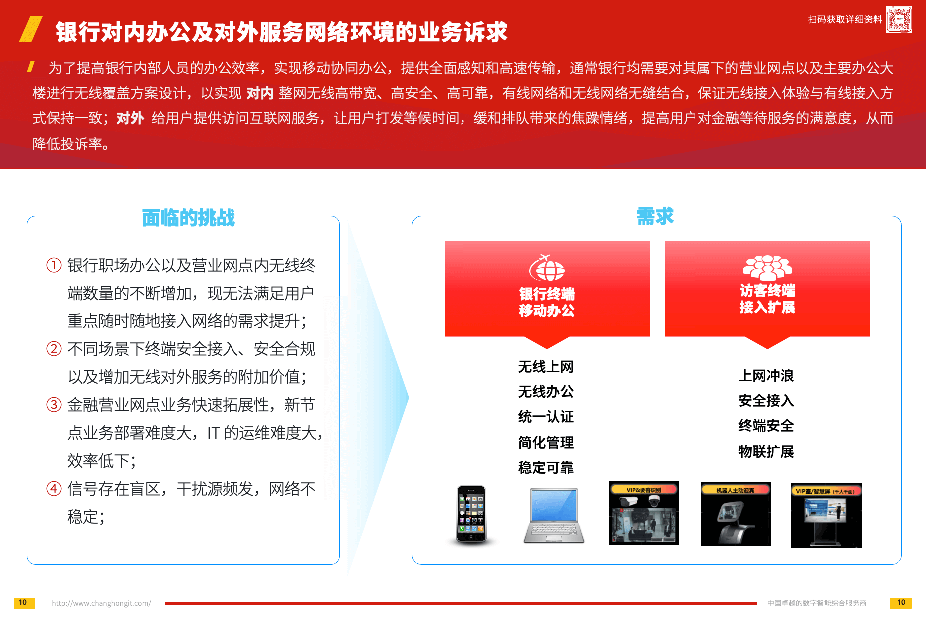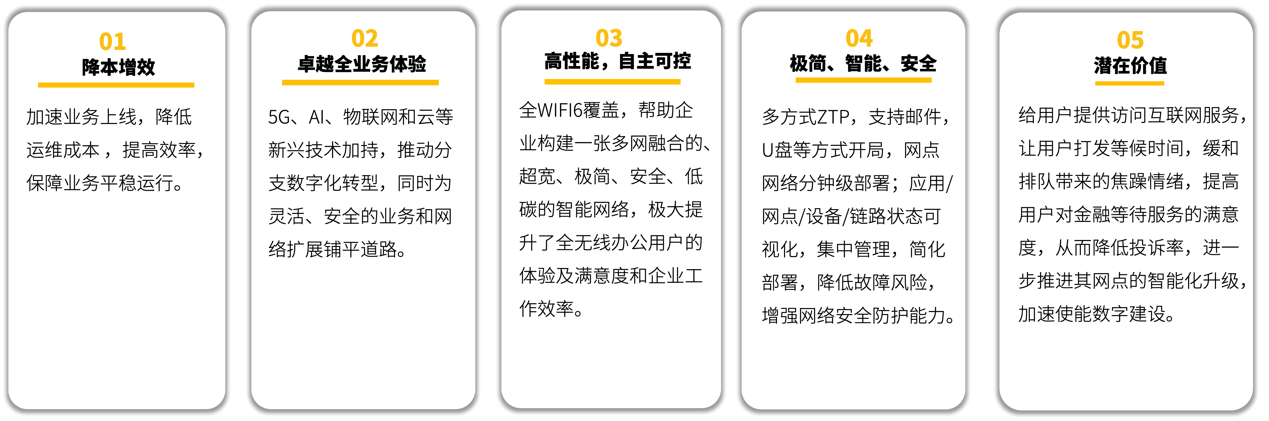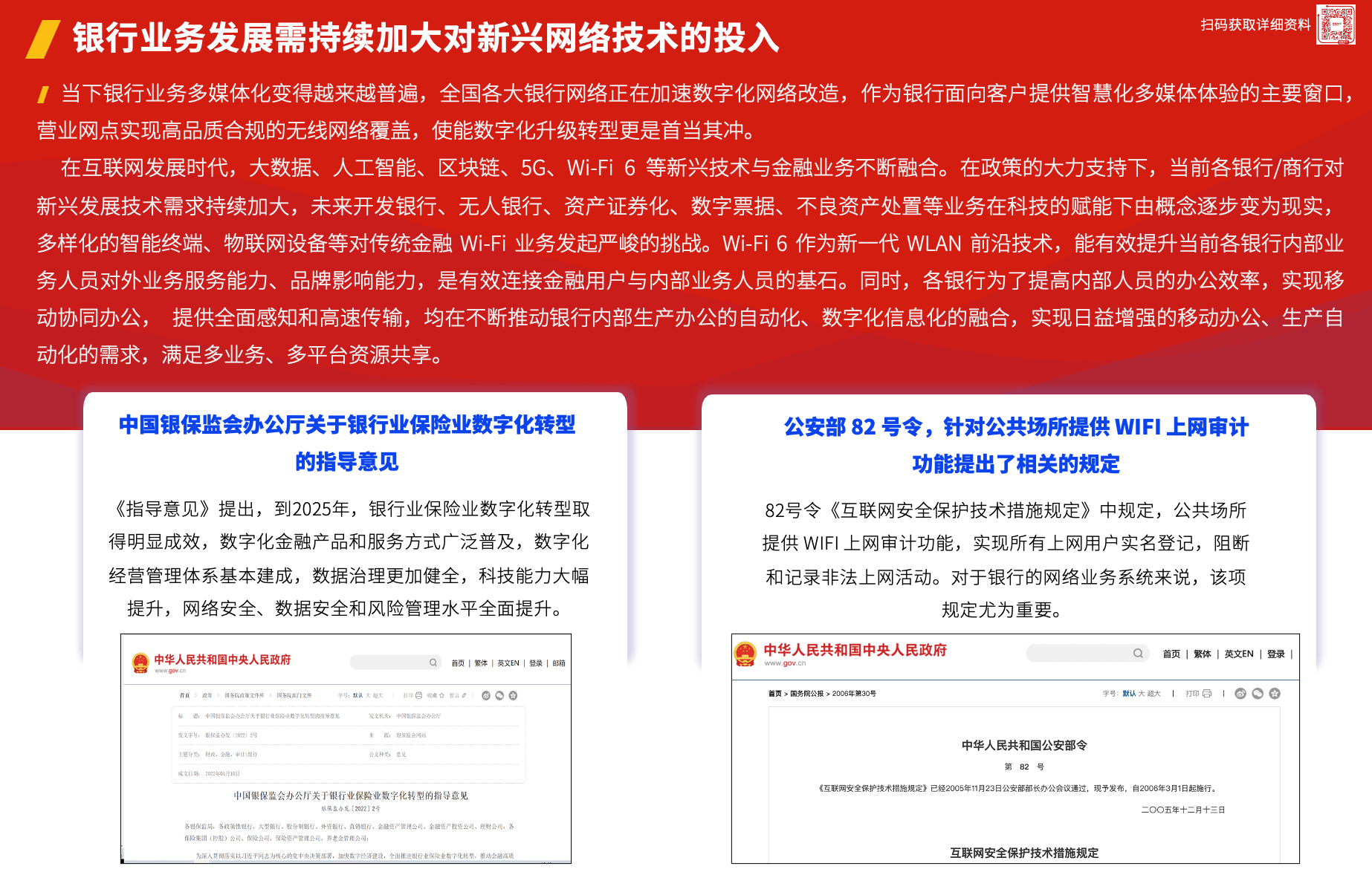 为了提高银行内部人员的办公效率,实现移动协同办公,提供全面感知和高速传输,通常银行均需要对其属下的营业网点以及主要办公大楼进行无线覆盖方案设计,以实现 对内 整网无线高带宽、高安全、高可靠,有线网络和无线网络无缝结合,保证无线接入体验与有线接入方式保持一致;对外 给用户提供访问互联网服务,让用户打发等候时间,缓和排队带来的焦躁情绪,提高用户对金融等待服务的满意度,从而降低投诉率。