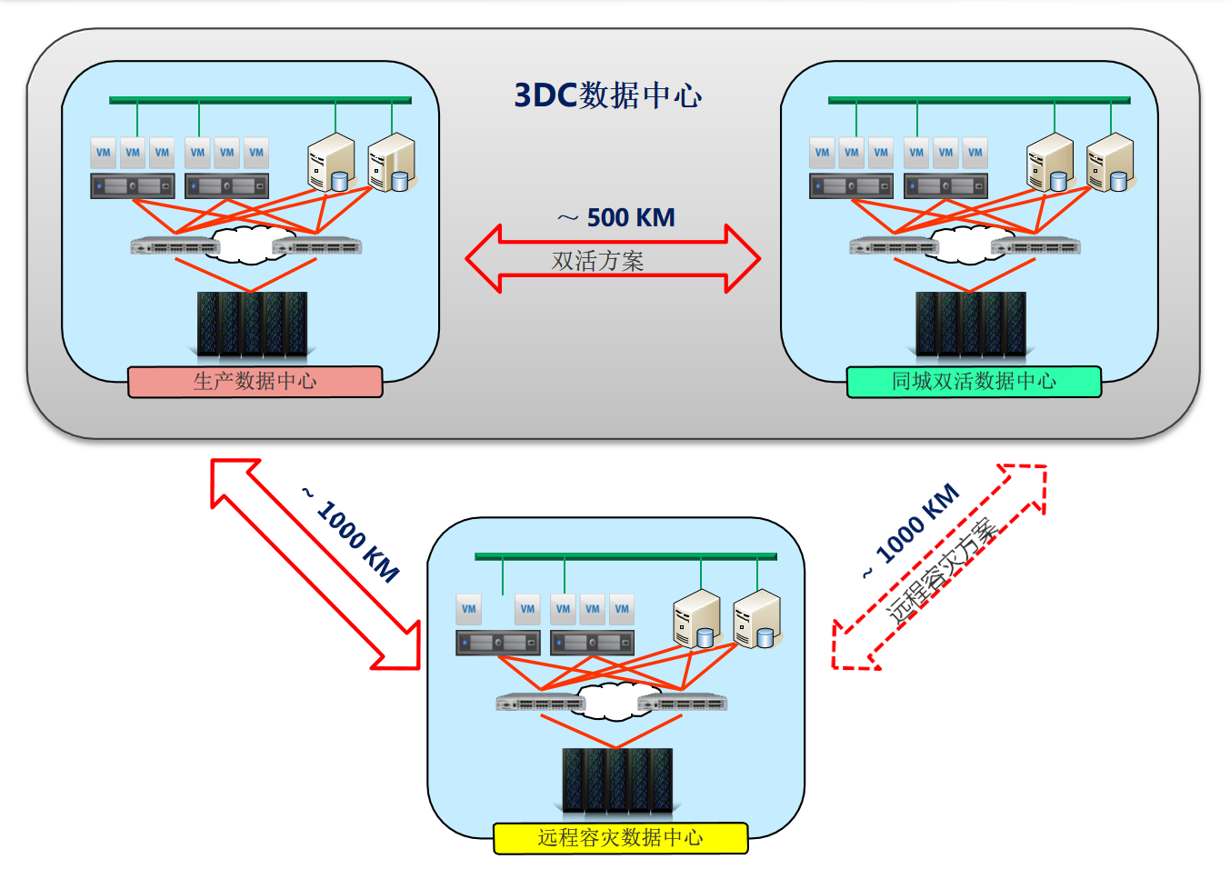 任何一个点的故障不仅不会引起数据服务停止,而且仍然具备两点的数据保护机制,该方案是国内各大金融机构、大型企业和政府部门对关键业务首选方案。