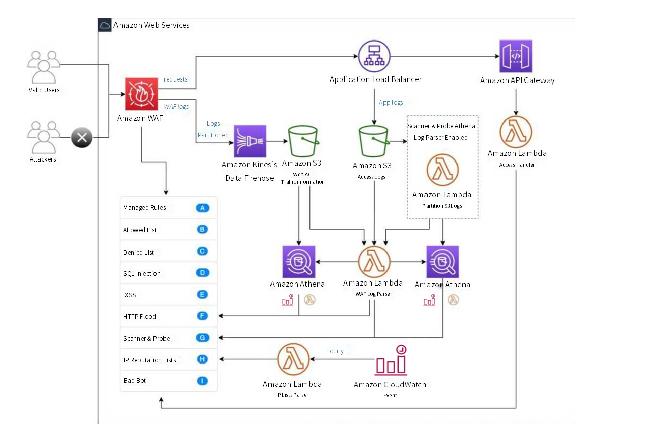该方案自动部署一系列Amazon WAF规则,以过滤常见的基于Web的攻击。客户可以从预先配置的保护性功能中选择,这些功能用于定义Amazon WAF Web访问控制列表(Web ACL)中包含的规则。在部署完成后,Amazon WAF检查请求,从而保护Application Load Balancer (ALB)。