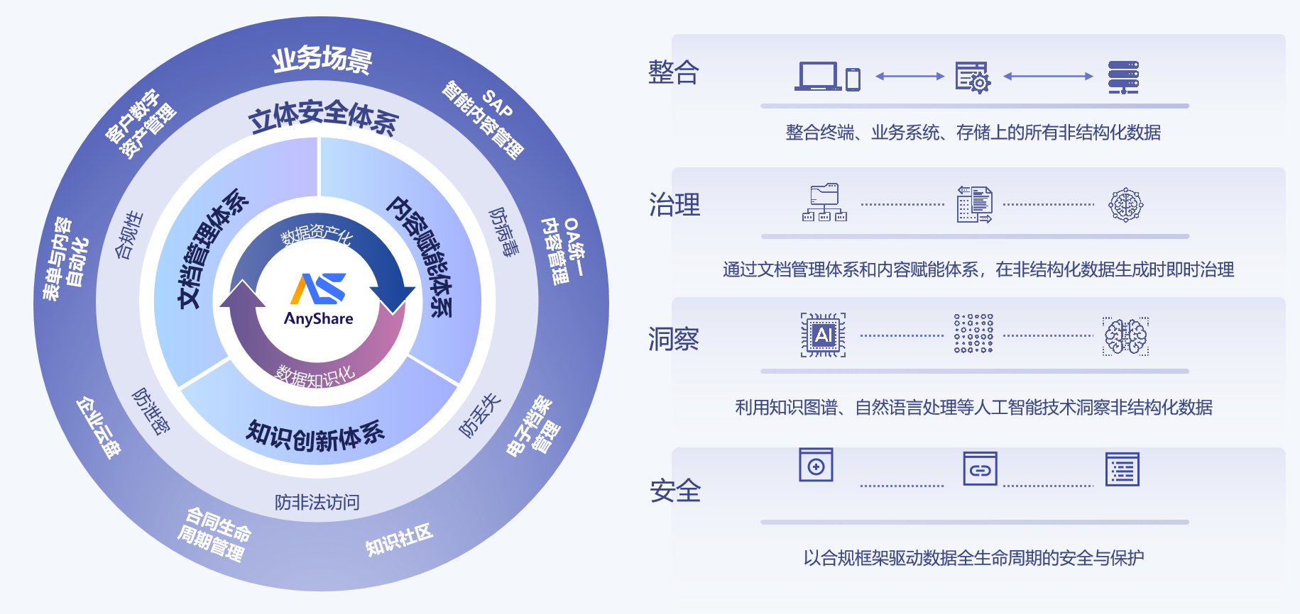 3、数据价值挖掘路径,非结构化数据中台主要基于业务主题落地,实现数据的整合、治理、洞察,进而实现资产化、知识化,非结构化数据中台涉及的业务主题主要有文档管理、内容赋能、知识创新。