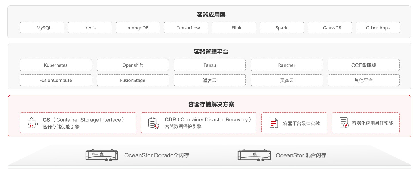 华为存储以高性能、易运维、易共享和高可靠的存储产品为底座,和广泛的容器生态伙伴进行合作,提供领先的容器存储解决方案。当前已完成与Kubernetes、Openshift、VMware Tanzu、Rancher、CCE敏捷版、FusionCompute、FusionStage、道客云、灵雀云等业内主流的容器管理平台的对接,帮助客户实现容器的快速部署和稳定运行。