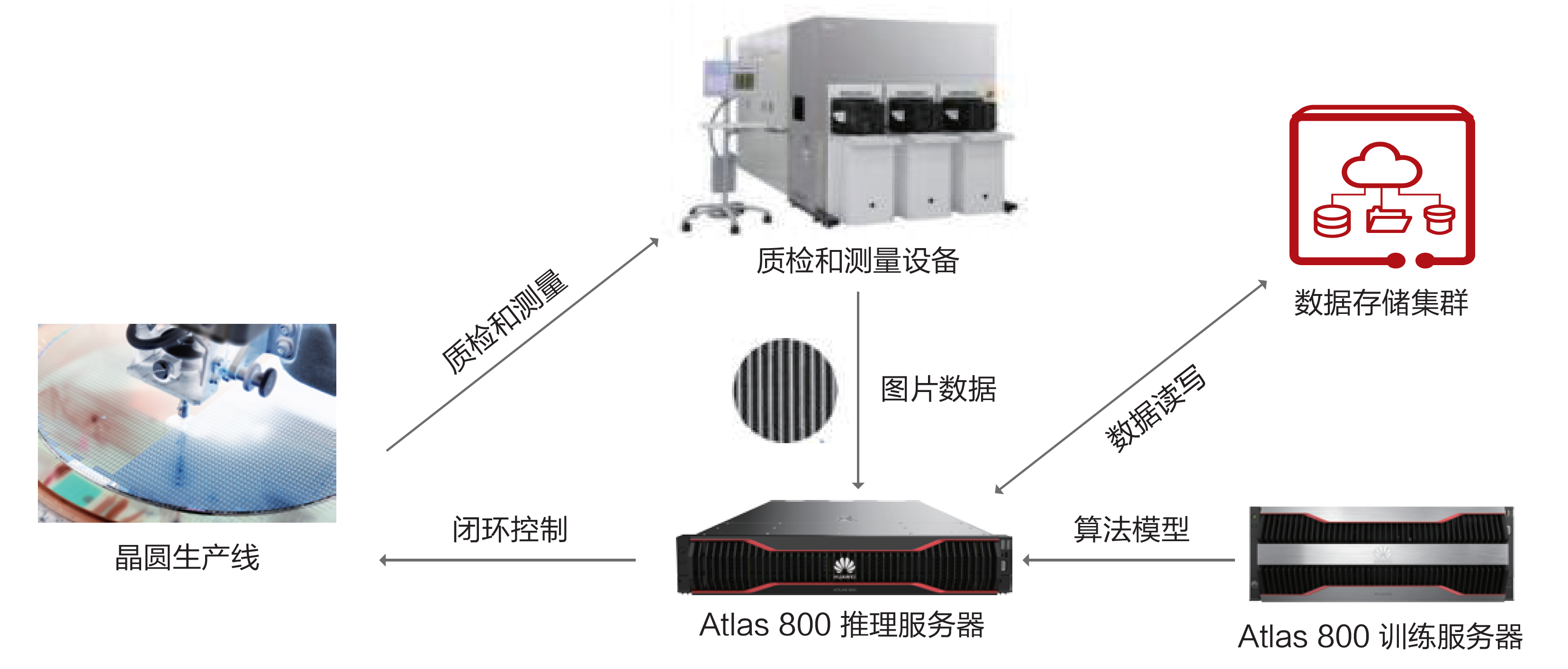 基于昇腾AI基础软硬件与埃克斯提供质检算法,半导体晶圆智能分析解决方案已与各种CIM/IT系统进行深度整合,形成完善的质检分析、溯源以及生产管控系统。采集到晶圆图片后,部署在边缘的Atlas 800 推理服务器可以实时进行缺陷分析,判断晶圆质量,同时将未识别图像回传至云端,云端的Atlas 800 训练服务器基于增量的未识别图片进行持续训练完成模型升级,新模型训练完成后可以直接对端侧模型进行更新,形成边云协同的闭环。
