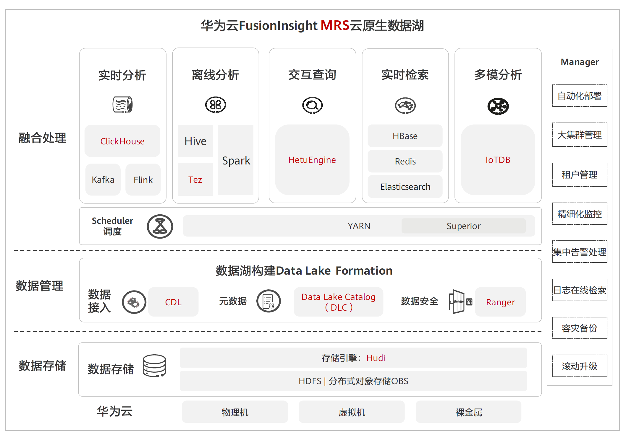 湖仓一体架构融合数据湖和数据仓库两种架构优点,具有高效、灵活、简洁的特点,降低传统湖仓割裂导致的系统复杂度,加速数据在湖内流动,全局采用一份数据支持多个场景。华为FusionInsight智能数据湖的全面云化,混合云可实时同步共享华为云创新能力。开放数据格式,让大数据分析和AI分析无缝衔接。丰富的数据和AI引擎,支撑数据查询、OLAP、时序、图、AI多场景