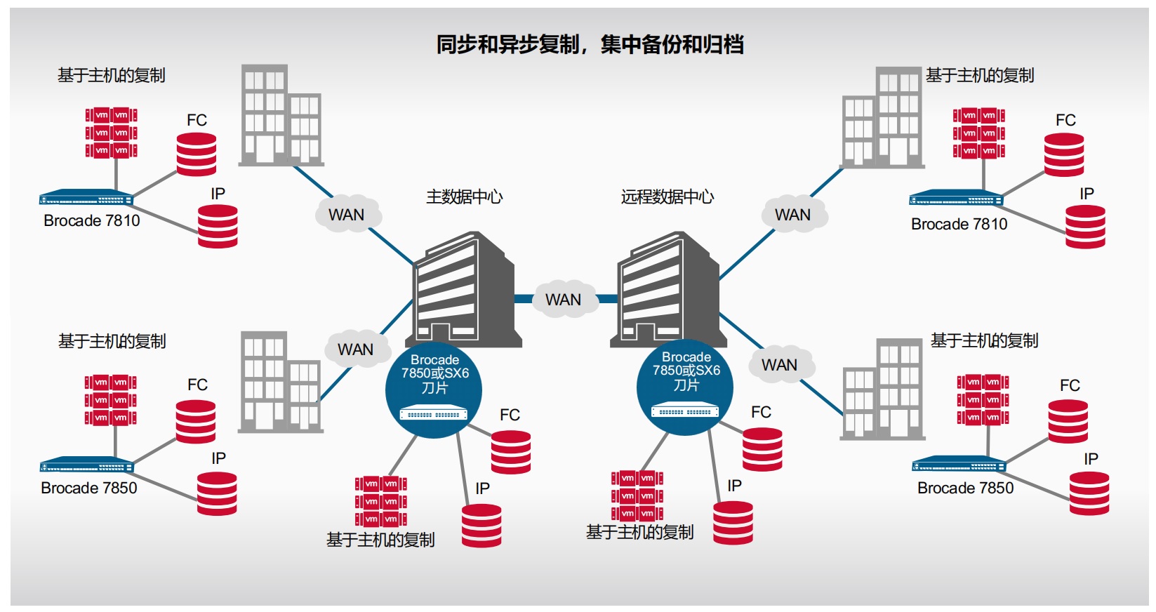 通过博科SAN导向器、交换机和延展交换机的组合,建立稳定的FC over IP链路传输,充分利用网络带宽,完成生产数据中心和灾备数据中心之间的数据复制;SAN网络连通对生产中心和灾备中心的SAN网络影响最小化,无需更改本地和异地SAN交换机的配置。
