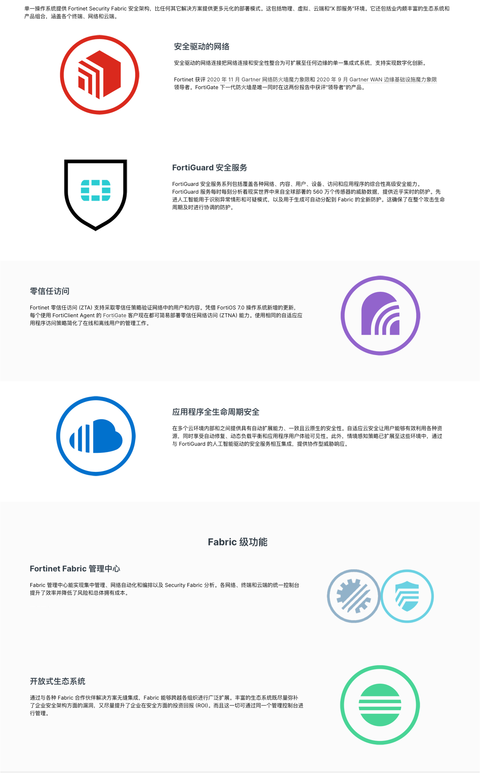 Fortinet Security Fabric 是一种综合性的网络安全架构,旨在提供端到端的保护、可见性和自动化。该解决方案基于一系列 Fortinet 产品和服务,通过集成和协同工作,为组织提供更强大、更智能的安全性。