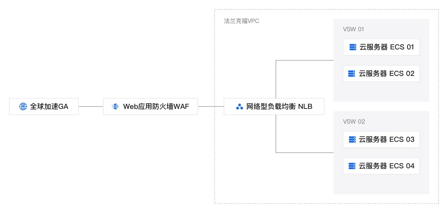 通过阿里云解析DNS服务解析到全球加速实例的CNAME,然后经过全球加速的监听功能流转到WAF,最后再通过WAF配置的监听和转发功能流转至NLB,并实现后端服务的负载均衡。方案提供的默认设置完成部署后在阿里云上搭建的网站运行环境如下图所示。实际部署时您可以根据资源规划修改部分设置,但最终形成的运行环境与下图相似。