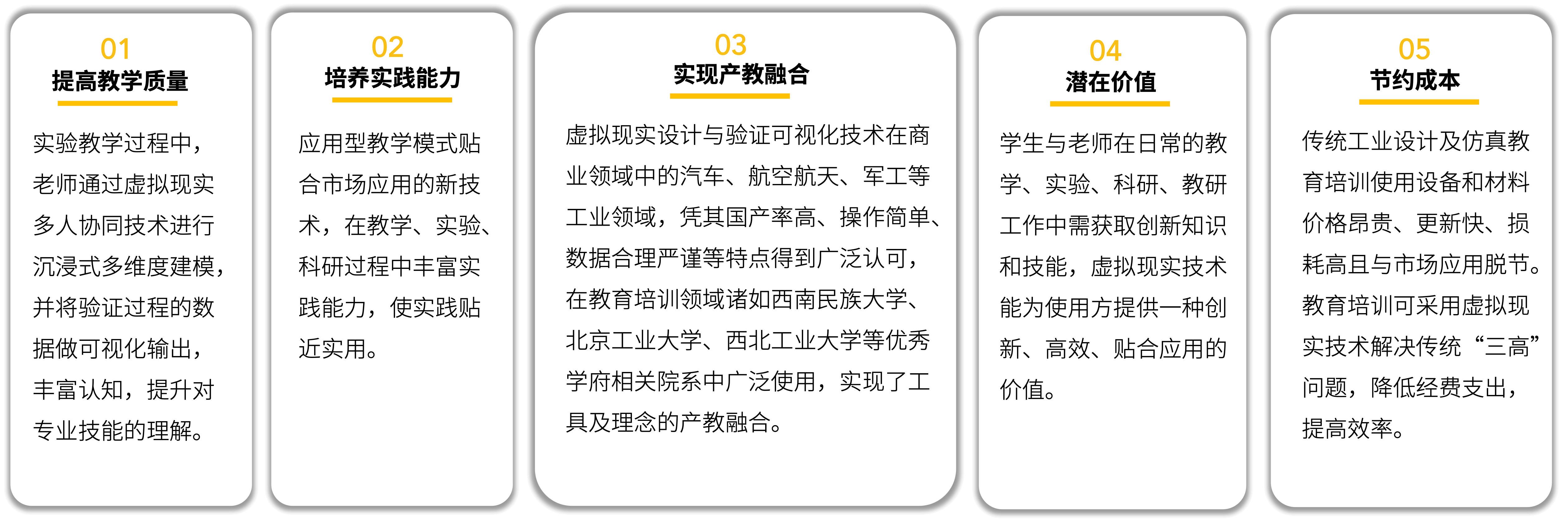 依託虛擬仿真技術,通過虛擬仿真實驗室建設,讓教育培訓工作實現完成某類型產品的設計、驗證、評審、成果輸出的全工藝流程實施及科研推進,實現對教改課改、實驗室、教學成果大賽等支撐賦能,打造學術交流平臺,創建工業設計專業羣。使用方通過虛擬仿真技術與工業設計專業的結合,建立沉浸式工業設計軟件全流程平臺,實現將行業工藝流程縮放至實驗室內,利用虛擬現實、多人協同、逆向工程技術對輔助設計、樣機評審、原型輸出等工作流程體現,達到以學術見長、懂業務、知流程優秀的工業設計水平,對齊行業標準,促進產學研一體建設模式共享...